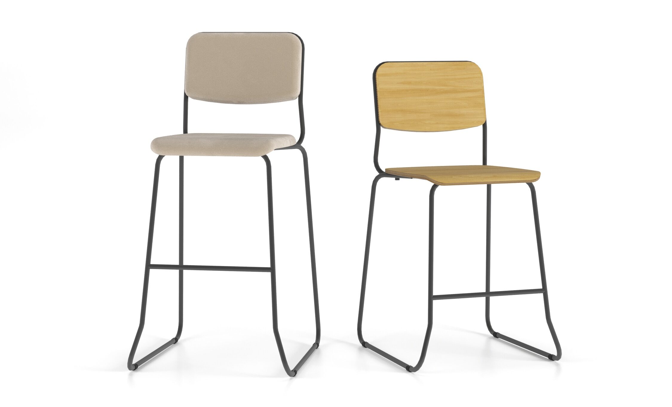 A banqueta tem estrutura de aço de carbono com pintura eletrostática de alta resistência e duas opções de acabamento: estofada com espuma de alta densidade e tecido ou revestidas em laminado melamínico.