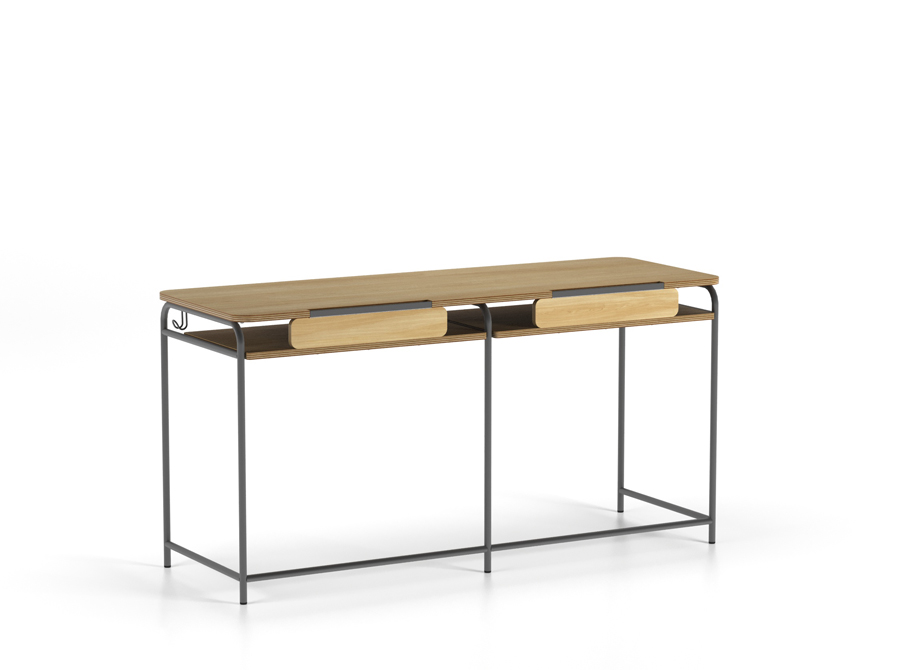 Fabricada com compensado multilaminado de madeira maciça, revestido com laminado melamínico, sua estrutura é feita de aço carbono tubular, com acabamento em pintura eletrostática, assegurando estabilidade e segurança.