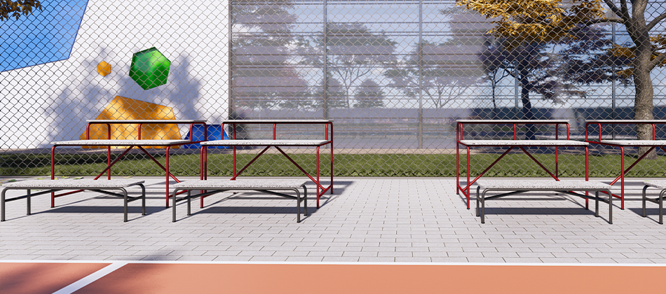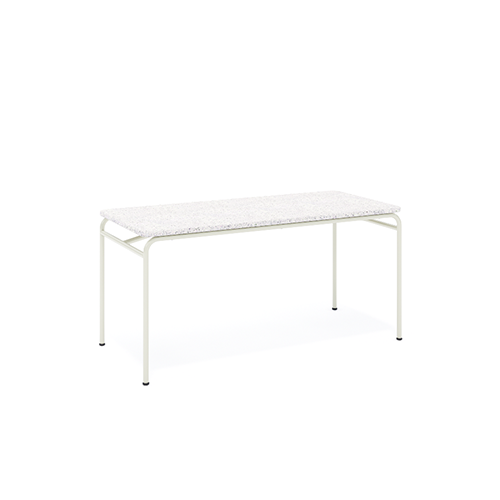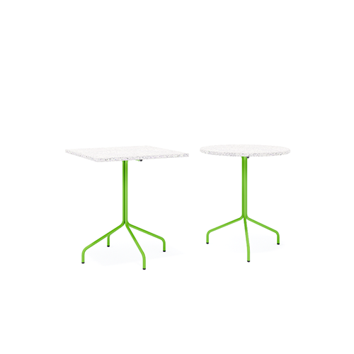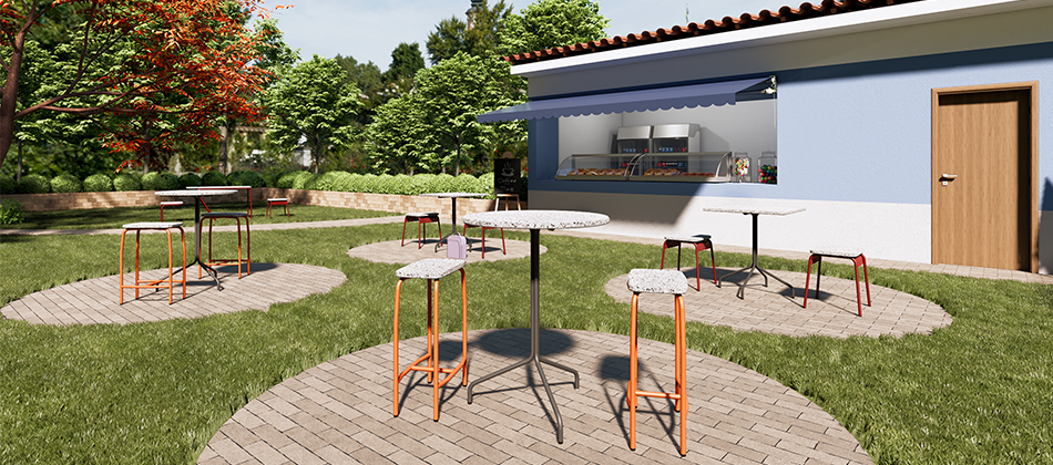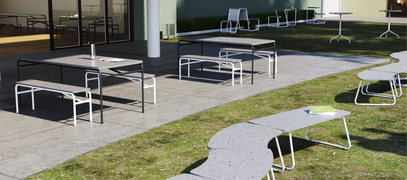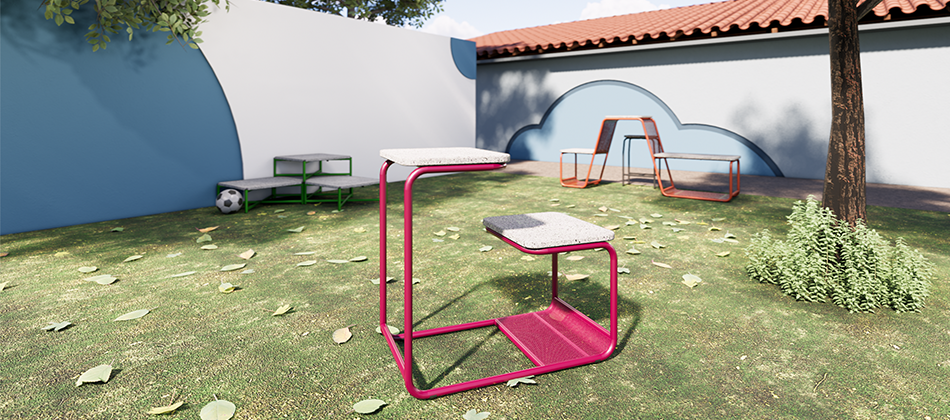 Móveis utilitários da linha Jataí, produzidos com ecoplacas de plástico reciclado e processos sustentáveis. Criados para uso coletivo em ambientes externos.