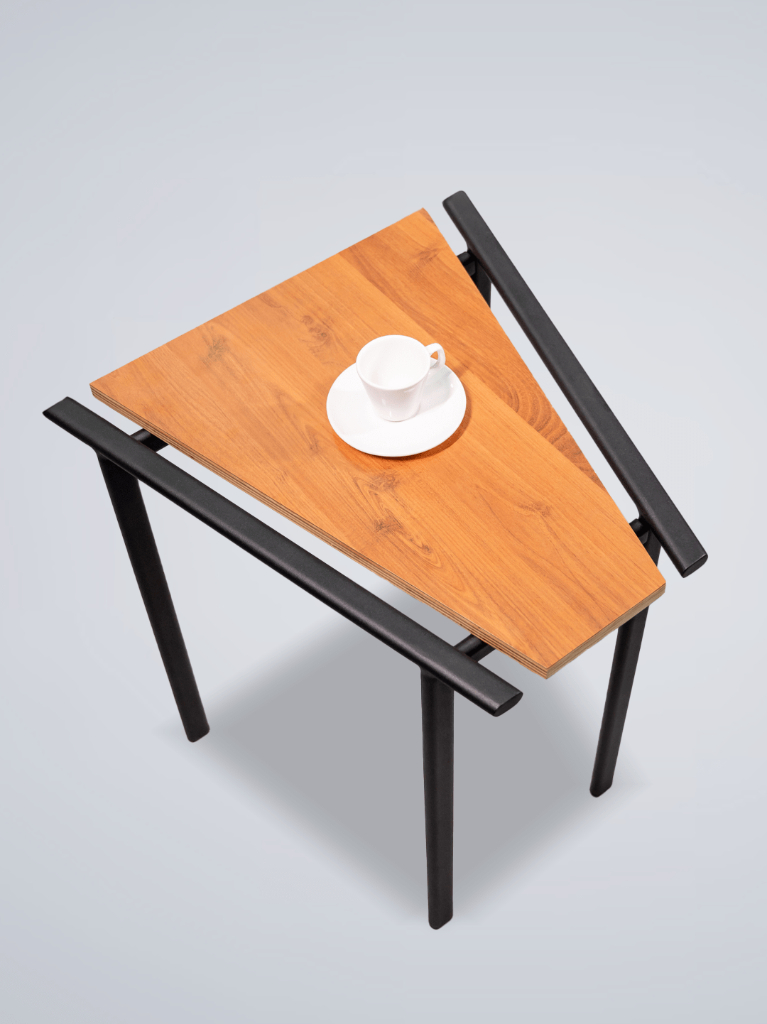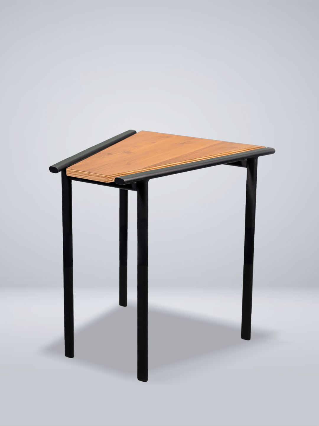 Com 55 cm de altura, a mesa auxiliar apresenta tampo trapezoidal: três bordas medem 50 cm e a quarta, 25 cm, o que possibilita a composição de diferentes layouts.