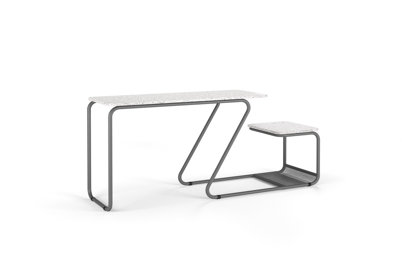 Seu design inovador apresenta prateleira abaixo do assento, que permite a armazenagem de mochilas ou outros itens durante o uso, oferecendo praticidade em locais como refeitórios, pátios escolares, jardins, áreas de convivência de hospitais, restaurantes corporativos e espaços externos de empresas.
