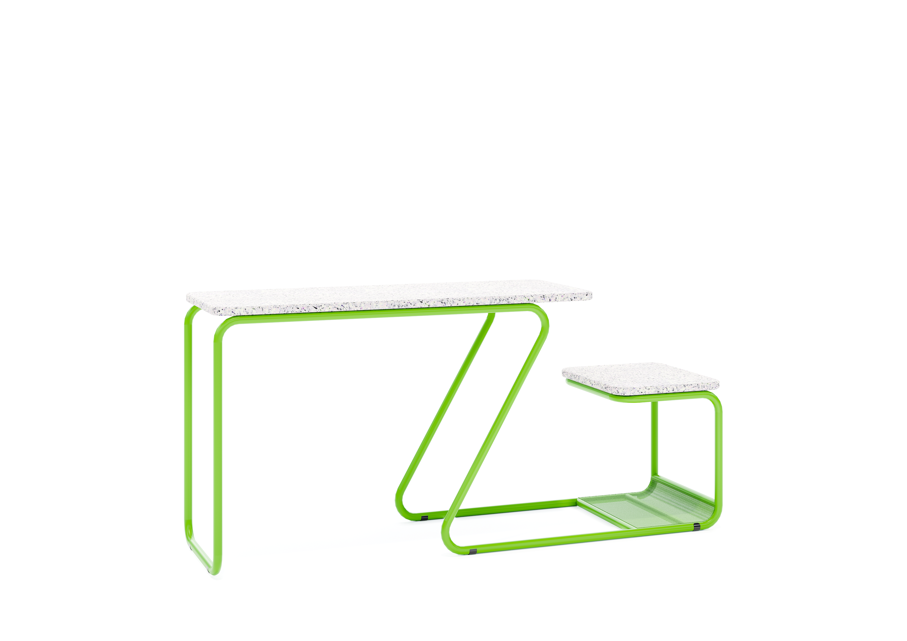 O tampo feito de ecoplaca, material sustentável produzido a partir de aparas recicladas de plástico, oferece resistência às intempéries e isolamento térmico.