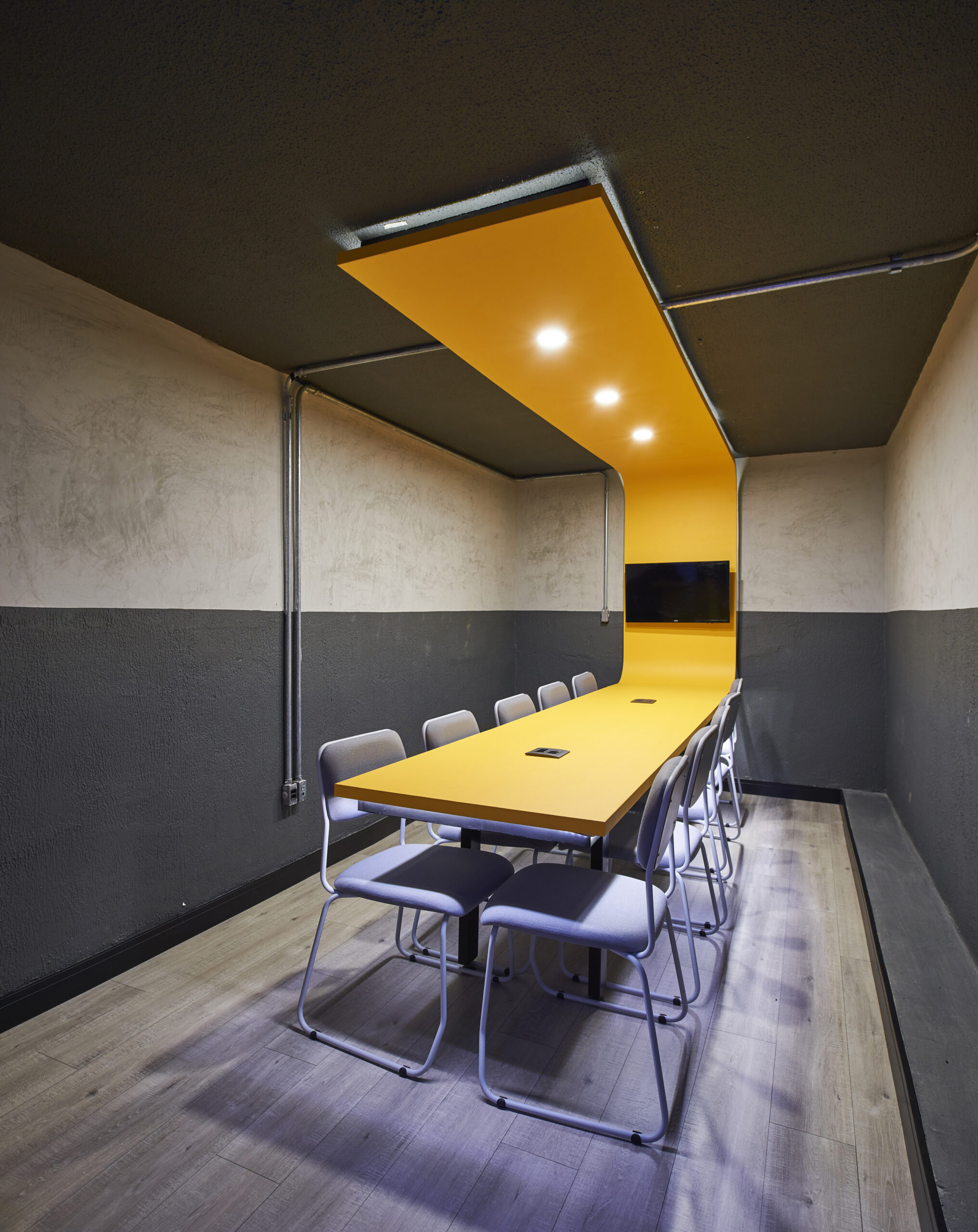 Numa das salas de reuniões projetada pela Mofo, o revestimento amarelo do tampo da mesa sobe pela parede e cobre também uma faixa do teto, acrescentando um efeito energético e alegre ao local, e de quebra desfazendo a atmosfera tradicionalmente sisuda desses espaços. Essa ideia sintoniza com a tendência de usar nuances brilhantes e saturadas de amarelo para conferir o que a WGSN chama de efeito “Dopamina”.